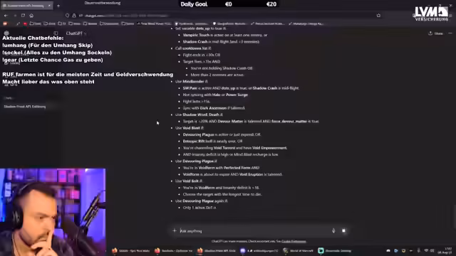 01:54:51Es wurden die Prioritäten für verschiedene Fähigkeiten wie Devolving Plague, Shadow World Death, Mindblast und Void Blast besprochen. Dabei wurde herausgearbeitet, dass Devolving Plague nur die höchste Prio hat, wenn es nicht aktiv ist. Shadow World Death wird immer als letztes ausgespielt. Die Rotation wurde anhand von Effekten wie Glow und den Bedingungen wie Rift-Aktivität strukturiert. Es wurde ein Framework für die richtigen spell-sequenzen geschaffen, das von Rift und Mindblast abhängig ist.