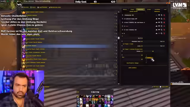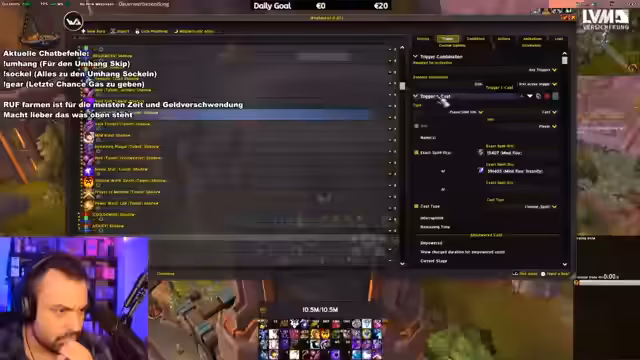 02:02:56Der Streamer passte sein Interface an, um mehr Klarheit zu schaffen. So wurden die Farben für Stack-Anzeigen und Channel-Dauern getrennt, um die visuelle Informationsüberflutung zu reduzieren. Es wurde ein Overcap-Protektor für Devolving Plague eingebaut, um einen Schaden durch zu hohe Insanity-Werte zu verhindern. Der Focus lag darauf, das gesamte System zu testen, insbesondere die Glow-Trigger für wichtige Fähigkeiten während des Rifts.