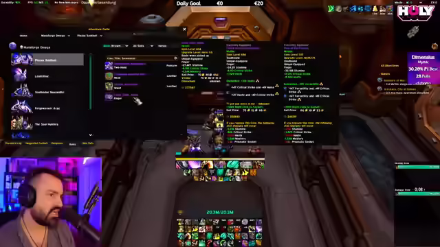 05:38:34Die erste Rolle ist ein Tank. Die Zuschauer dürfen entscheiden, welcher Tank gespielt wird (DK, Demon Hunter, Druide, Monk oder Krieger). Der Monk gewinnt die Abstimmung und erhält Lumitas Living Silk im Raid, was den Weg für Heiler ebnet. Es gibt auch eine Zweihandwaffe mit Haze, aber nicht High Haze. Diskutiert wird, ob Miss Viva gespielt werden soll und welche Stats (Krit, Versa) gewünscht sind. Die Frage nach einem Crit-Verser-Ring im Raid wird aufgeworfen, und die Möglichkeit, dass ein solcher Ring im ersten Boss droppt, wird diskutiert. Die erste Kiste wird geöffnet, wobei die Waffe als Müll abgetan wird. Es wird überlegt, ob ein Gürtel genommen werden soll, obwohl der Hikrit Haze nicht optimal ist. Der Patch 11.2.5 am 7. Oktober, der Remix Legion, Turbo Boost und die Aufhebung des Cap Crests sowie Dinar bringt, wird erwähnt. Die Entscheidung, ob auf ein Welt verzichtet werden soll, wird diskutiert. Ab jetzt hat fast jeder Char einen Vierer-Bonus, was bedeutet, dass die Aufladungen für die Schmiede flexibel genutzt werden können. Der Gürtel wird in drei Wochen generft, daher wird empfohlen, nach Alternativen Ausschau zu halten. Der Gürtel wird als okay, aber eher gelb in der Wertigkeit eingestuft.