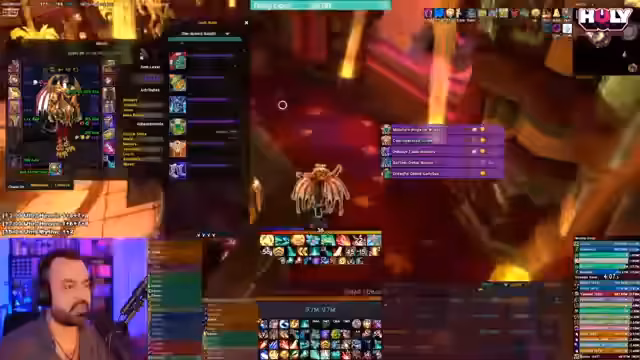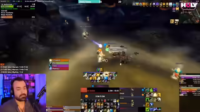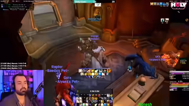 01:40:03Der Streamer diskutiert mit dem Chat über die Wahl des zu zockenden Charakters und den bevorzugten Dungeon-Schwerpunkt. Er zeigt sich klar für ein Mythic Plus-Blasten und favorisiert Arcane Mage, den er auf 8 Keys bringen möchte, oder Destro/Demo Warlock. Andere Vorschläge wie Schamane (Enhancer/Resto), Holy Padda, Arcane Mage, Balance Druid und Outlaw Rogue werden ebenfalls erwogen. Der Tank-Slot ist offen, wobei ein DH-Tank im Titel erwähnt wird. Die Anforderungen für Viewer Raids werden als hoch definiert, da die Ziele effiziente Runs und World Ranks sind, nicht das Erlernen der Dungeons.