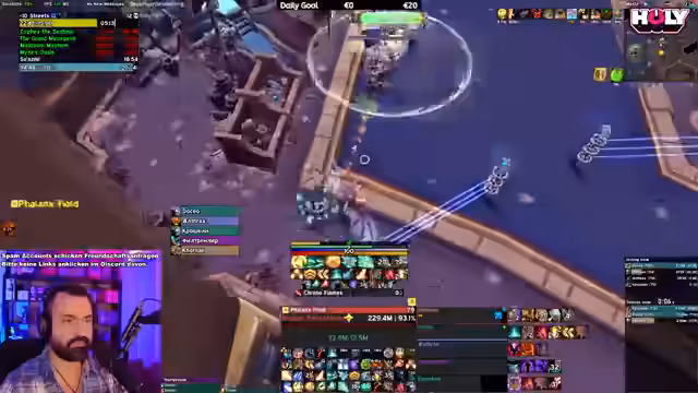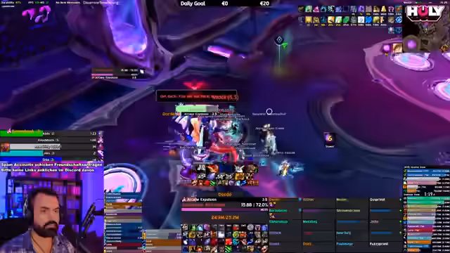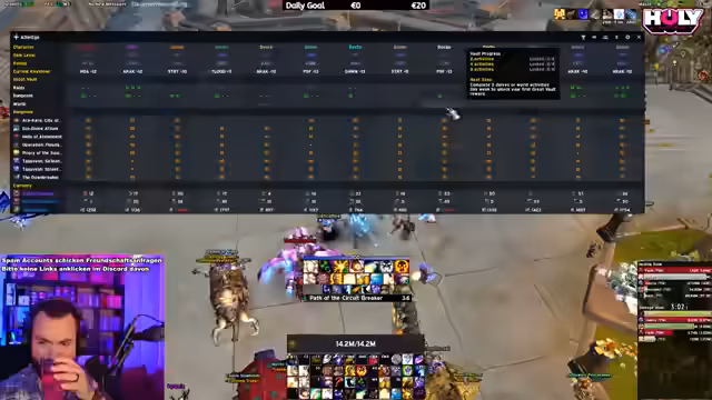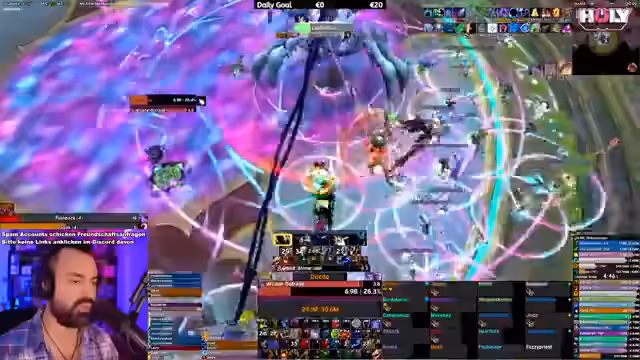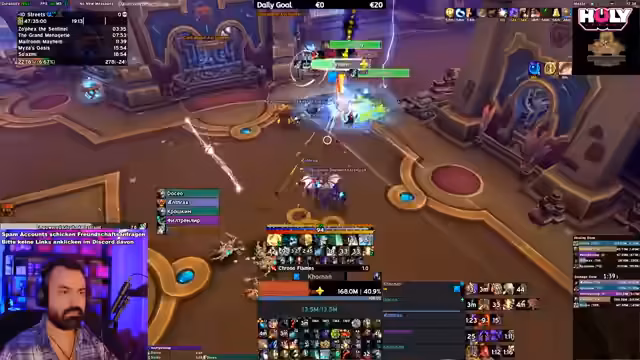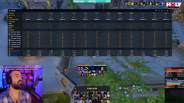 08:38:44Der Streamer berichtet über seine Leistung im Dungeon, wo er 5 Millionen DPS erreicht, aber auch Fehler macht. Er erwähnt Probleme mit seiner Trap und Stuns, sowie seine mentale Anspannung während des Sub-Rogue Gameplays. Er zeigt Bewunderung für die Leistung eines anderen Spielers namens Fury und beschreibt die Herausforderung, mehrere Klassen gleichzeitig zu spielen und zu meistern. Die Gruppe hat Schwierigkeiten mit bestimmten Dungeon-Mechanics und Affixen.