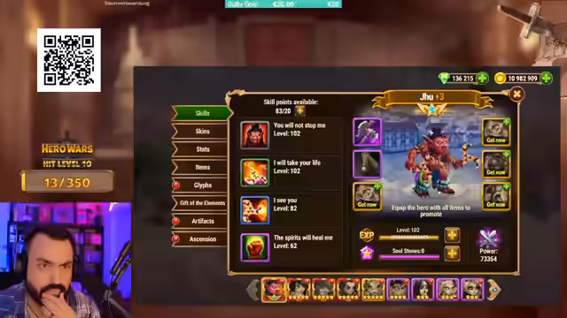 04:50:10Der Streamer beschäftigt sich intensiv mit der Suche nach Items, Glyphen und Artefakten in Hero Wars. Er untersucht das Kampagnensystem, bei dem er durch das Finden und Sammeln von Gegenständen seine Charaktere verbessern kann. Das Equipen der Helden mit gefundenen Items wird als entscheidend für den Fortschritt dargestellt, während PvP zunächst als gestört betrachtet wird. Streamer scheint einen Glitch im Spiel entdeckt zu haben, der ihm ungewöhnlich viel Gold bringt, was er zur Level-Up seiner Helden nutzt.
