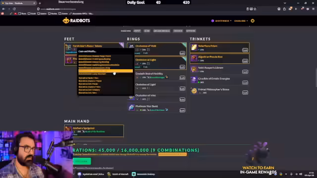 03:12:13Nach intensiver Simmung und Rücksprache mit erfahrenen Spielern wie WordUp und Zymphy kommt es zu einer Neubewertung der Ringe. Der Loa-Ring zeigt sich als rund 0,5% besser als die alternative Arcano-Weave-Ring-Option, was die Entscheidung für zwei Nexus-Ringe bestätigt. Der Streamer erkennt einen Fehler in seiner ursprünglichen Planung, den Ring zu craften, und bleibt stattdessen bei den Ringen. Der endgültige Plan ist, die Ringe zu behalten, Beine zu craften und mit den verbleibenden Crests die Boots herzustellen, um die Ausrüstung weiter zu optimieren.