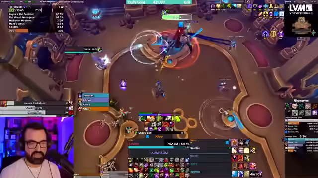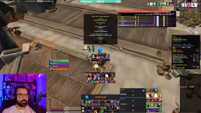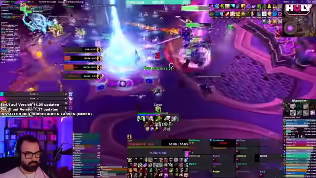 07:09:19Der Streamer bereitet sich auf einen Raid mit seinem Warlock vor und hofft, nicht schlecht abzuschneiden, da er sich mit einem erfahrenen Warlock messen muss. Er vergleicht sein Gear mit dem der anderen Gruppenteilnehmer und stellt fest, dass er nicht mehr so schlecht ausgerüstet ist. Ein Zuschauer fragt nach einer bestimmten WeakAura, woraufhin der Streamer erklärt, wo man diese finden kann und verweist auf die Wichtigkeit des Dream State für Eulen. Er erklärt, dass er sich gegen Havoc entschieden hat und für Plexus Sentinel skillt. Er hilft einem Zuschauer bei der Suche nach einer WeakAura für Totems und teilt Links im Chat. Es wird kurz über die Push-to-Talk-Taste auf der Maus diskutiert. Der Streamer lädt einen DPS für den Raid ein und erklärt, dass sie fünf Bosse machen werden. Er reagiert auf Kommentare im Chat und teilt seine Meinung zu bestimmten WeakAuras. Abschließend erklärt der Streamer, dass er nicht den Boss ins Target nehmen darf, weil sonst die Mobs pullen.