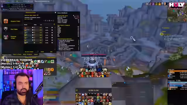 10:38:30Der Streamer beschäftigt sich intensiv mit der Optimierung seiner Ausrüstung, insbesondere mit dem Ring 'Footbomb of Mythic' und dessen Upgrade. Er führt eine Simulierung durch, um zu bestätigen, dass der Ring trotz Item-Level-Unterschied besser ist. Während des Wartens auf einen Tank simuliert er erneut seinen Charakter und diskutiert über die Herausforderungen, die Cooldowns und deren Synchronisation mit Kill-Times in Mythic+-Dungeons mit sich bringen.