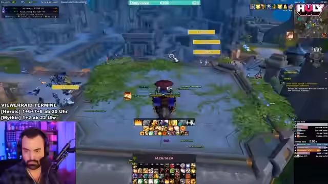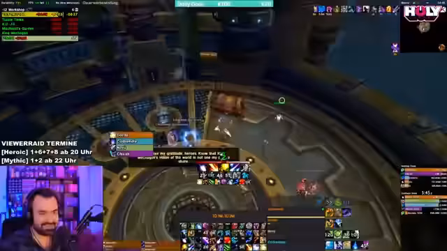 12:32:49Nachdem die vorherige Gruppe als zu unerfahren und unkoordiniert eingestuft wurde, startet der Streamer den Aufbau einer neuen Gruppe. Eine Abstimmung wird durchgeführt, um die Tankklasse zu bestimmen, wobei Warrior und Warrior als DPS-Optionen favorisiert werden. Der Streamer erklärt seine anfängliche Wahl des Fury Warriors, die sich als sehr erfolgreich herausstellt, mit einer hohen Schadensleistung und ständiger Verfügbarkeit von Cooldowns. Ein neues Ziel wird definiert: der Streamer möchte mit seinen Followern einen 'Battle royale'-ähnlichen Wettstreit veranstalten, bei dem er gegen die Mains der Community antritt.