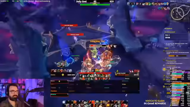03:02:49Eine Gruppe für einen Mythic Plus Dungeon startet. Der Streamer spielt einen Warlock und gibt Einblicke in seine Spielweise, insbesondere den Opener und Rotation. Es stellt sich jedoch heraus, dass seine Hotkeys nicht optimal konfiguriert sind, was den Gameplay-Flow stört. Die Gruppe kämpft sich durch mehrere Mobs und Pulls. Der Streamer berichtet über seine Herausforderungen als Heiler, als er kurzzeitig einen Schamanen spielt und seine fehlenden Hotkeys und die neuen Mechaniken eines Bosses bespricht, wie z.B. den proc von Healing Surge Totem.