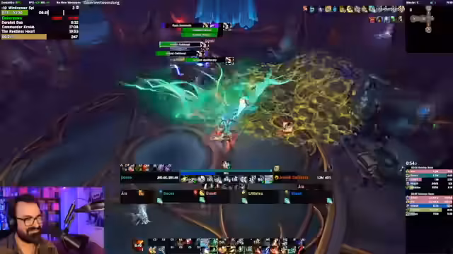 05:08:43Die Gruppe nimmt die Herausforderung an, einen 10er Windläufer-Dungeon mit einem extrem schlecht ausgestatteten Heiler zu absolvieren. Der Streamer hat nur Item Level 2,29, ist unverzaubert, ungesockelt und trägt kein Tier-Set. Trotzdem beginnt der Dungeon, und es kommt zu einem sehr heftigen Pull, bei dem der Streamer Schwierigkeiten hat, seine Manakosten zu managen und ein Dispel zu wirken, was den Erfolg des Pulls gefährdet.