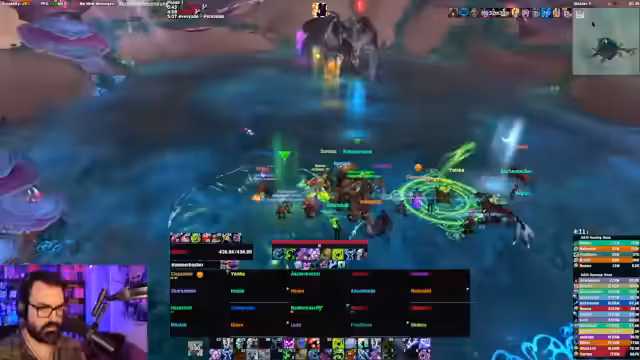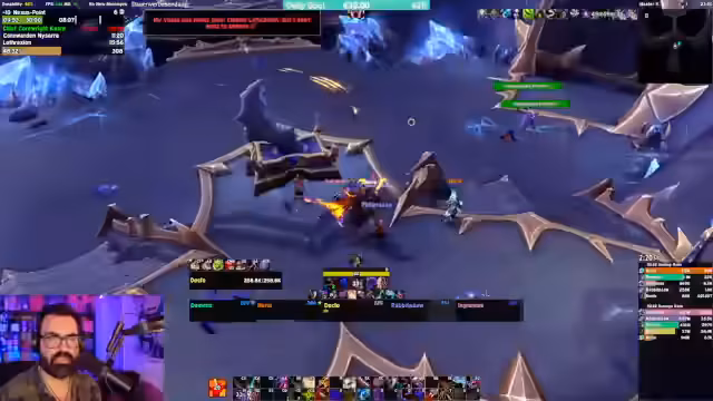 04:01:56Die Gruppe diskutiert über die Zusammenstellung für den bevorstehenden 10er Maisara-Dungeon. Der Streamer unternimmt den Versuch, mit einem 23er Item Level ungeübten Disziplin-Priester zu heilen, was als hohe Challenge angesehen wird. Es kommt zu einem sehr schwierigen Pull mit einem Doppelpack von Monstern, die explodieren, wenn nicht sofort sauber geleert werden, was zum Tod des Streamers führt. Nach dem Pull werden die Heiler-Taktiken und die Notwendigkeit der Dispel-Funktion besprochen.
