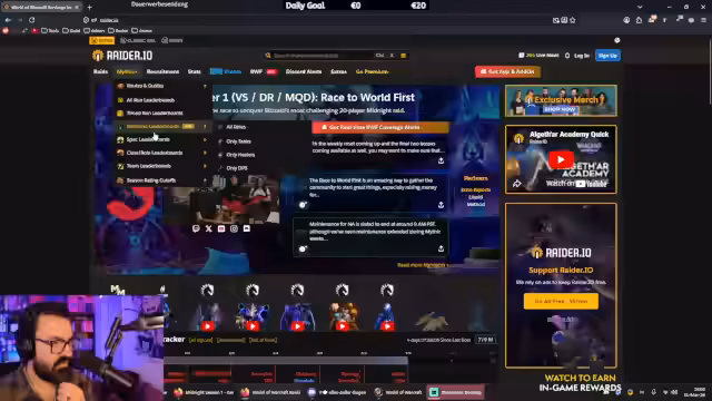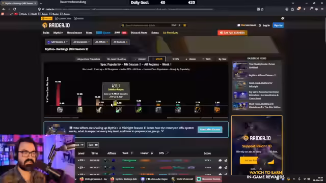 02:15:12Der Streamer gibt einen Überblick über die aktuelle Meta-Analyse in den M+ Dungeons. Bei den Tanks ist Brewmaster Monk unangefochten an der Spitze, während bei den Heilern Restoration Schamane stark ist. Bei den Range DPS ist Frost Mage und Demonologie Warlock sehr stark. Er äußert seine Enttäuschung über den Zustand von Rogue, der seit BFA keine Top-Plätze mehr erreicht, und findet, dass die Klasse wieder mehr Anerkennung verdient hat. Er beobachtet auch eine Renaissance von Feral Druid und Unholy Death Knight.