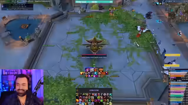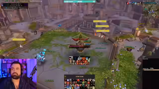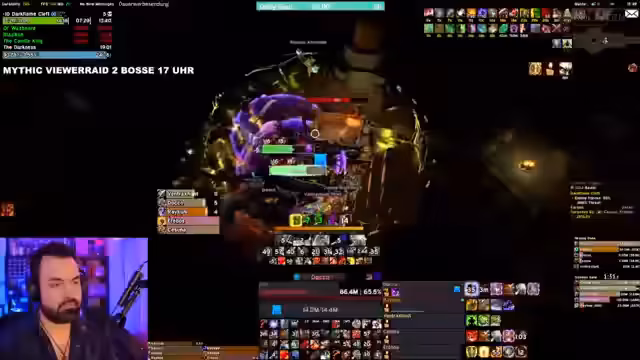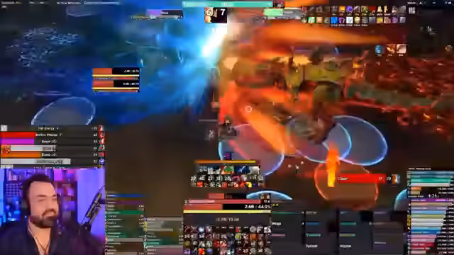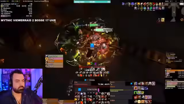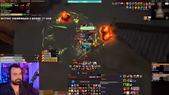 05:32:40Die Strategie wird erneut angepasst, da eine Fläche im Laufweg des Teams platziert wurde. Der Streamer weist die Gruppe an, zukünftige Flächen wegzulegen, und markiert eine Position am Totenkopf für den Notfall. Es wird die Rotation der Ads fortgesetzt, und der Fokus liegt darauf, alle Adds schnell zu zerstören. Der Streamer analysiert die Performance und stellt fest, dass einige Spieler zu viel Schaden auf dem Boss machen und nicht auf die Adds switchen, was kritische Verzögerungen verursacht.