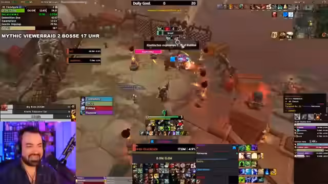 09:41:52Es wird über den aktuellen Stand der Mythic+ Dungeons und Raid-Guides gesprochen, die auf Bandit Progress verfügbar sind. Es wird festgestellt, dass bereits über 50 Gilden den Maxi-Dauern-Content abgeschlossen haben. Es wird ein Aufruf gestartet, Mythic+ Dungeons zu spielen, und die Zuschauer werden ermutigt, ihre Analysen und ihr Engagement fortzusetzen. Der Streamer äußert sich zu einem UI eines Zuschauers und lobt dessen Funktionalität. Eine veraltete 3-Tank-Taktik bei einem bestimmten Boss wird diskutiert. Es wird über die Vorbereitung auf unerwartete Wipes gesprochen und wie man diese überspielt, um die Zuschauer nicht zu beunruhigen. Es wird analysiert, wie viele Keys noch für die Vault benötigt werden und entschieden, keine neuen Vaults mehr anzufangen, sondern die angefangenen abzuschließen. Ein Warlock wird für einen Key gesucht und ein Rookery Key gestartet.