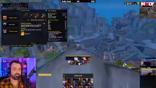 07:55:10Es wird eine Unternehmung gestartet, bei der der Streamer sich einer zufälligen Gruppe anschließt, um undercover zu spielen. Er äußert seine Vorliebe für einen Outlaw Rogue für die aktuelle Saison und wählt bewusst eine hochbewertete Gruppe mit einem Devastation Evoker und einem Fury Warrior. Er bemerkt jedoch, dass die Gruppe hauptsächlich aus deutschsprachigen Spielern besteht, was seine Tarnung gefährdet, und versucht, dies auf Englisch zu verschleiern, woraufhin er prompt aufgedeckt wird.