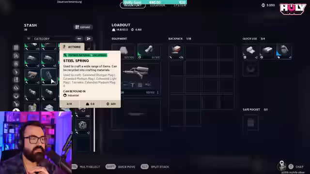 03:07:17Das Gameplay wird detailliert gezeigt. Der Streamer nutzt zunächst ein Freeloadout, um ohne Items loszuziehen und Ressourcen wie Metall oder Stoff zu sammeln. Er looteert in Gefahrenzonen, um besseren Loot zu finden, und wird von Gegnern und anderen Spielern gejagt. Die Extraktion ist der riskanteste Teil, da man den gesammelten Loot nach unten transportieren muss, während der Zeitdruck steigt und Gegner und andere Spieler zuschlagen.