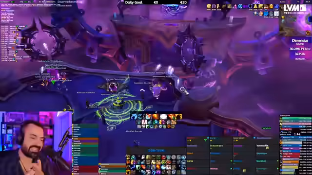 00:28:45Aufgrund des akuten Bedarfs an Crests wird eine Gruppe für M+ Dungeons zusammengestellt. Der Streamer sucht gezielt nach einem Heiler und einem Tank, während er selbst Damage machen möchte. Es werden mehrere Keys anvisiert, jedoch tauchen technische Probleme auf. So ist der Halls-of-Valor-Dungeon buggt und zählt nicht für die wöchentliche Quest, was zu Verwirrung führt. Die Chatmitglieder helfen bei der Klärung, während der Streamer versucht, alternative wie Gambit oder Echo-Dome zu nutzen.