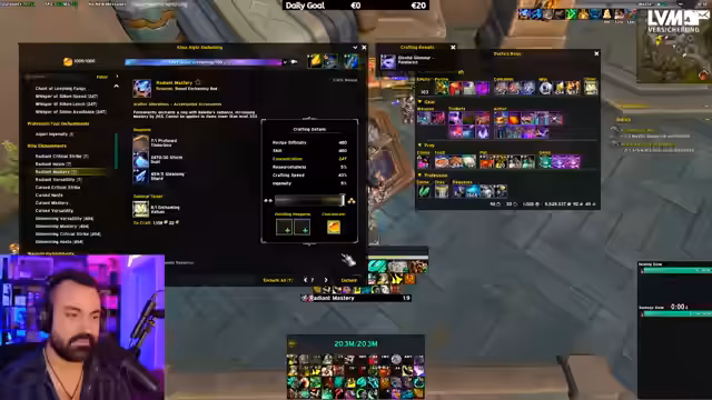 00:00:01Der Stream beginnt mit dem Willkommen der Zuschauer und der Erwähnung, dass der Streamer gerade seinen Opener für den Ele-Schamanen gefunden hat. Nach der Begrüßung der Chatmitglieder wird das Hauptziel für den Stream klar: der Ele-Schamane steht im Fokus, da er für den Tag als wichtigste Klasse gilt. Es besteht jedoch eine Zeitnot, da der Streamer zügig 90 Crests sammeln muss, um sein Character-Gear zu verbessern. Parallel werden die Kosten für Spellthreads und Sunset Spellthreads thematisiert, die ebenfalls teuer geworden sind.