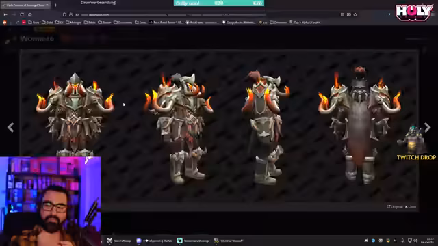 07:42:31Der Streamer beginnt die Vorstellung der neuen Raid-Set-Armuren für das Midnight-Add-on, beginnend mit dem Rogue-Set. Er erzählt humorvoll eine Anekdote, wie der Sohn eines Entwicklers das Design beeinflusste, indem er forderte, dass 'überall Dolche' sein müssten. Anschließend zeigt er die Design-Entwürfe für den Schamanen, der Elemente wie erhitzte Erde und Feuer manifestiert, und bewertet dieses Set sehr positiv. Auch das Warlock-Set wird vorgestellt, das als 'eines der coolsten Sets seit langem' gelobt wird und dessen Gestaltung an einen Gladiator erinnert.