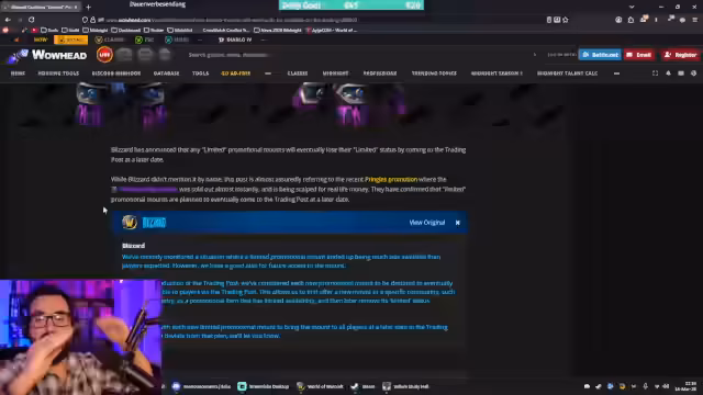 03:51:34Ein unerwartetes Thema ist der Skandal um die limitierte Pringles-Mount-Promotion in Deutschland. Aufgrund massiver Bots und Skalper, die die 3000 Mounts vor dem offiziellen Start einlösten, wurde die Aktion unterbrochen. Dies führte zu großem Unmut in der Community. Blizzard reagierte jedoch und bestätigte, dass der Mount zukünftig für alle über den Trading Post verfügbar sein wird. Diese Lösung wird als bestmoglicher Schritt angesehen, um den Skandal beizulegen und den Wert des Mounts zu erhalten.