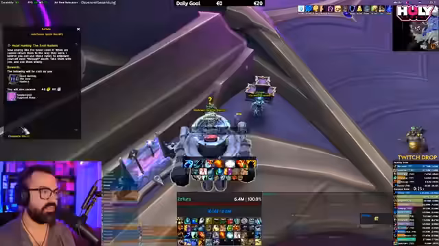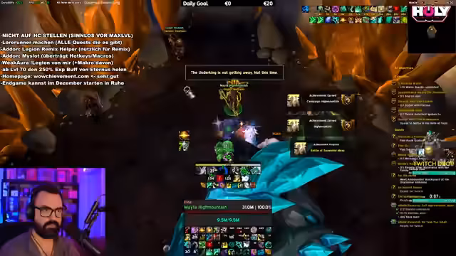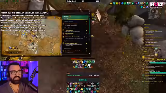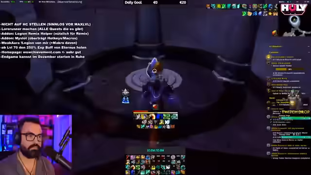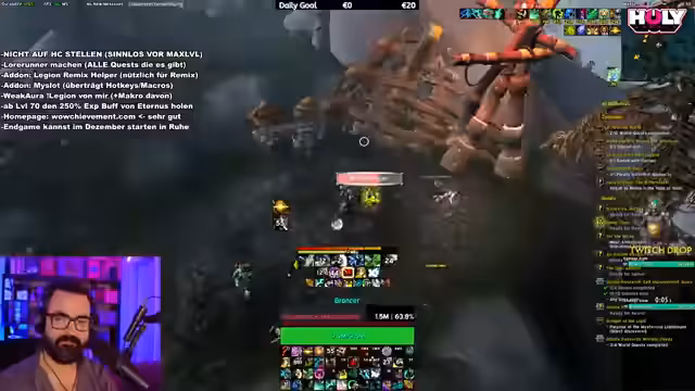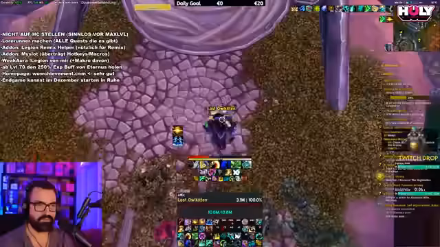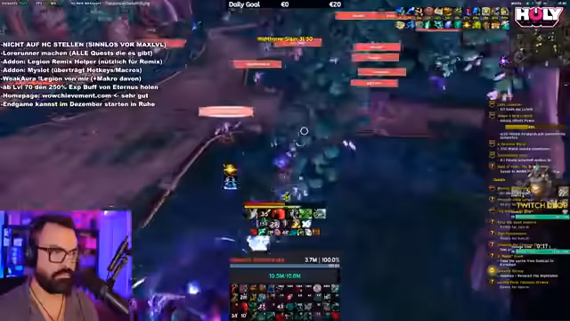 07:43:16Ein erfolgreiches Mythic-Raid wird absolviert, aber die Streamerin persönlich hat keinen Loot bekommen, was sie frustriert. Es wird der Plan für den nächsten Tag kommuniziert, wo ein weiteres Raid mit der Community geplant ist. Danach geht es weiter mit dem Questen in Legion Remix auf dem hohen Schwierigkeitsgrad, wo große Mengen an Gegner getötet und Quests abgeschlossen werden. Es wird über die große Dichte an Spielern gesprochen und die Bequemlichkeit von Quest-Add-ons betont.