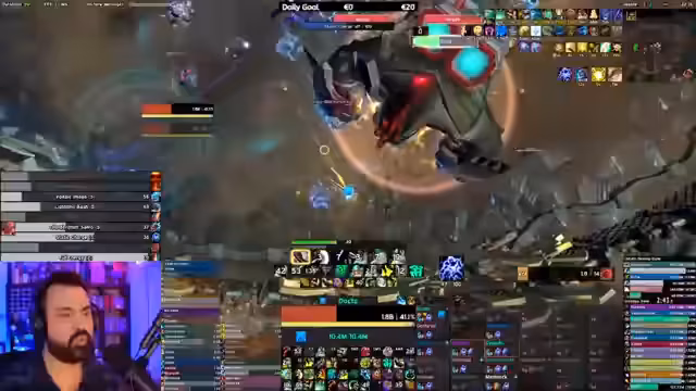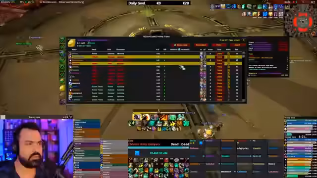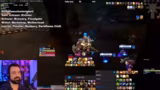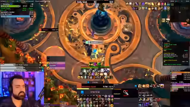 14:44:10Eine wichtige Ankündigung unterbricht den regulären Raidfluss: die Meldung, dass die Gilde Rex Troy den ersten Mythic-Down von Gallywigs erreicht hat. Dies löst im Stream und der Gruppe große Aufregung aus. Es wird über die Weltrekordjagd gesprochen und über die Methoden von Rex Troy, die teilweise als fragwürdig angesehen werden. Der Streamer bewundert die Leistung, sieht aber auch mögliche Konsequenzen wie Banns von Blizzard.