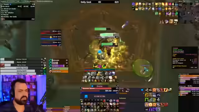 08:01:19Der Streamer wechselt die Szene und beschäftigt sich mit der Taktik gegen bestimmte Trash-Mobs, die sich selbst töten, wenn man sie kontrolliert (CC) und in Bewegung hält (kite). Für den Endboss in einem Dungeon wird erwähnt, dass man diesen erst freischaltet, wenn man sechs von sechs Dungeons in der Woche absolviert hat. Es folgt eine allgemeine Einschätzung, dass die aktuelle Dungeonsaison sehr heilerintensiv ist und mehr aktives Heilen erfordert, was als positives Feedback für die Community gewertet wird.