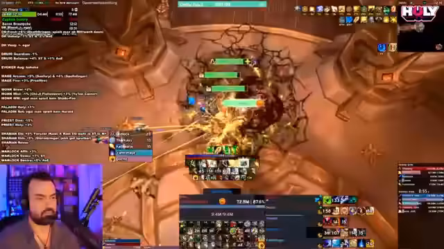 03:21:33Es wird die Frage nach MRT-Profilen aufgeworfen und erklärt, dass diese über ein Addon zugänglich sind, das Profile zur individuellen oder gemeinsamen Installation bietet. Einem Zuschauer wird für seinen Prime-Beitrag gedankt, der ihm Zugriff auf die Profile ermöglicht. Es wird die Bedeutung von Blattlass hervorgehoben, gefolgt von Anweisungen zur korrekten Ausführung von Mechaniken und zum Umgang mit Einschlägen. Die Heiler werden angewiesen, bestimmte Aufgaben zu übernehmen, während Gruppen für spezifische Aktionen eingeteilt werden. Der Einsatz von Dev-CDs und Immunities wird koordiniert, um den Boss effektiv zu bekämpfen. Die Spieler werden angewiesen, sich zu verteilen und die Techniker auszuschalten, bevor sie die restlichen Bomben heruntertragen und sich auf den Boss konzentrieren. Es wird eine Camp-Strategie für vorne links und vorne rechts festgelegt, während die Heiler im hinteren Bereich positioniert werden. Die Spieler werden angewiesen, sich gegenseitig zu heilen und Dev-Ziele zu ziehen, während die Techniker ausgeschaltet werden. Die restlichen Bomben sollen heruntergetragen und dann der Boss attackiert werden. Es wird auf die Intermission hingewiesen und die Spieler werden aufgefordert, die Blitze auszuweichen und Schaden zu verursachen. Die Melees werden angewiesen, in die Absorptionsflächen zu gehen, während sich die Ranges verteilen. Es wird die Bedeutung der korrekten Positionierung und des Zusammenspiels hervorgehoben, um die Mechaniken erfolgreich zu bewältigen und den Boss zu besiegen.