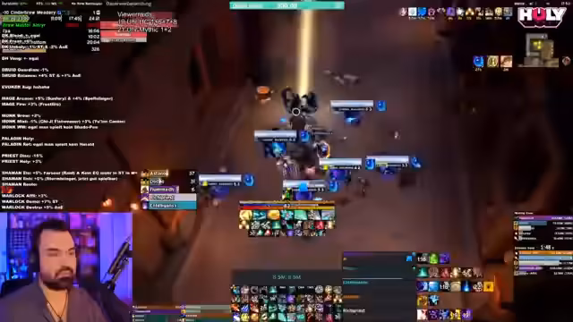12:01:48Es wird über die Kombination von Hitchikoda mit russischem Kochwasser gescherzt. Der Streamer lobt den Outlaw und freut sich, dass der Heiler sein BiS-Item bekommen hat. Es wird erwähnt, dass Mille Blood live ist. Es folgt eine Diskussion über die Auswirkungen von D-Stil plus minus 15, insbesondere in höheren Keys. Ein Mitspieler bittet um Feedback zum Tanken, welches positiv ausfällt, insbesondere das Pacing und das Einsammeln der Adds. Es wird jedoch angemerkt, dass der Tank zu sehr versucht hat, einen bestimmten Gang zu tryharden, was zu Zeitverlust führte. Es wird ein zukünftiges, separates Addon von Details erwähnt. Es wird diskutiert, welche Ausrüstung ein bestimmter Charakter benötigt und festgestellt, dass er keine bestimmten Items benötigt. Der Streamer erwähnt, dass er sich auf bestimmte Sachen konzentrieren muss und eigentlich den Mate spielen müsste. Es wird nachgefragt, wo man das Addon herunterladen kann und der Name des Addons wird genannt. Abschließend wird über die lange WoW-Spielzeit des Streamers gesprochen und Pläne für zukünftige Mage Keys erwähnt.