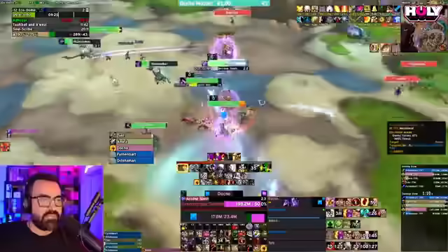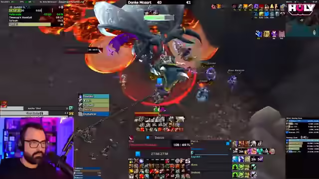 06:19:57Während des Bosskampfes traten erneut Probleme mit der korrekten Ausführung der Mechaniken auf. Dome machte wiederholt Fehler und wurde vom Streamer korrigiert, der ihm seine Farbe ansagte. Es wurde festgestellt, dass Dome ein Problem mit seinen Addons hatte, was zu falschen Anzeigen führte. Der Streamer wies ihn an, die WeakAura zu deinstallieren und neu zu installieren. Es wurde auch festgestellt, dass Pauli gestorben war, weil er zu langsam reagierte und zu viel Schaden erlitten hatte. J-Ray und Lido hatten ebenfalls Probleme mit dem Stacken von Debuffs. Der Streamer erklärte die Bedeutung von Zweierkreisen, um Schaden zu minimieren und sich bei Bedarf weit zu verteilen. Trotz der Schwierigkeiten konzentrierte sich die Gruppe darauf, den Boss zu besiegen, und der Streamer behielt Dome im Auge, um sicherzustellen, dass er die richtigen Aktionen ausführte. Nach mehreren Versuchen wurde der Boss schließlich besiegt, was die Soulhunter-Schuhe freischaltete. Der Streamer bedankte sich bei den Teilnehmern, insbesondere bei Trock, der zum ersten Mal dabei war und gute Arbeit geleistet hatte.