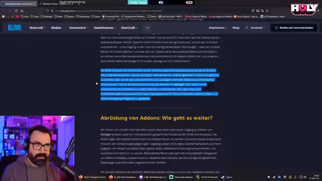 05:42:05Viele kosmetische Addons funktionieren in der aktuellen Beta nicht mehr, nicht weil sie Automatisierungen bieten, sondern weil sie auf alten API-Versionen basieren. Die neue API erfordert komplett neu geschriebene Addons. Viele Entwickler sehen keine Notwendigkeit, ihre bestehenden Addons umzuschreiben, besonders wenn sie kein Geld damit verdienen. Entwickler wie L2I und WeakAuras stellen ihre Arbeit teilweise ein.