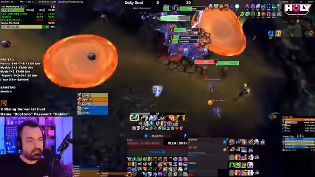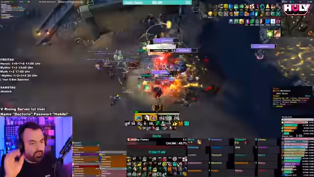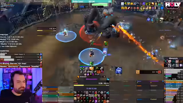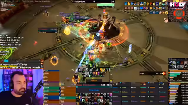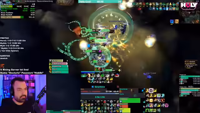 06:28:23Im weiteren Verlauf des Raids koordiniert der Streamer die Gruppen für den Boss Ventrax präzise. Er teilt die Spieler in Immunitäts- und Nicht-Immunitäts-Gruppen auf und gibt exakte Anweisungen zum Ausweichen von Flächen und zum Platzieren von Bomben. Es wird betont, dass alle Defensiv-Cooldowns gemeinsam auf der grünen Seite eingesetzt werden müssen, um die Mechanik zu überleben. Die Gruppe muss zügig agieren, um den Boss in die nächste Phase zu bringen.