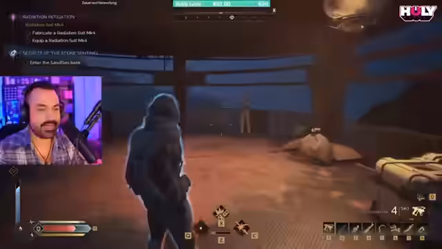 04:38:38Nachdem die Base-Ressourcen voll sind, fährt der Streamer zu einer Quest-Stelle. Er nutzt einen aktiven Suspensor-Gürtel, um einfacher zu navigieren. In einer Höcle kämpft er sich durch feindliche NPCs, deren Blut er absaugt. Ein gefundener 'Penis Schilder' markiert den Weg zu einem Container mit einer Quest. Der Kampf fordert Medikits und Granaten, und der Streamer klärt das Farb-System für Türen, das das Auffinden von Schlüsseln vereinfacht.