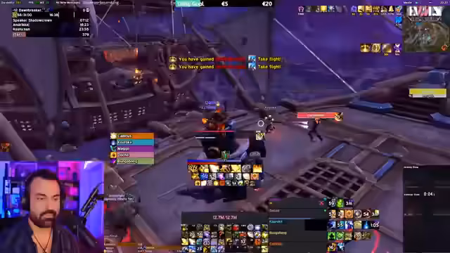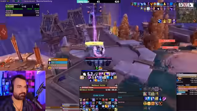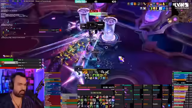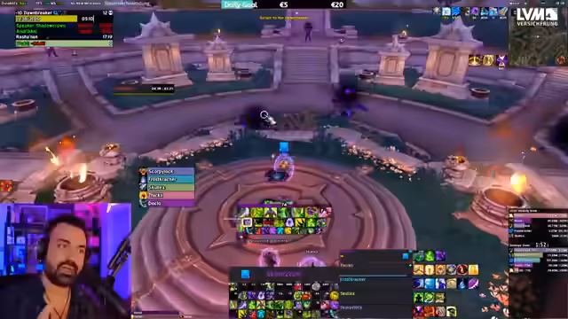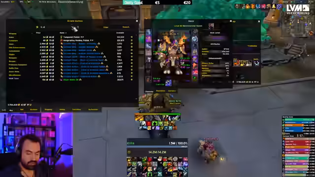 01:34:56Der Stream beginnt mit Koordinationsproblemen im Dungeon, bei denen es um den richtigen Einsatz von Fähigkeiten wie 'True Shot' geht und die Bereitschaft der Gruppe für den nächsten Pull. Der Streamer äußert sich frustriert über seine eigene Spielweise und den Wechsel zum MM-Spec, den er als gefährlich empfindet. Später wird der Charakter gewechselt und die Ausrüstung diskutiert, wobei geprüft wird, ob Schultern oder Kopf durch einen Trade verbessert werden können. Bei der Ausrüstung wird ein Item-Level von rund 5 Millionen erwähnt.