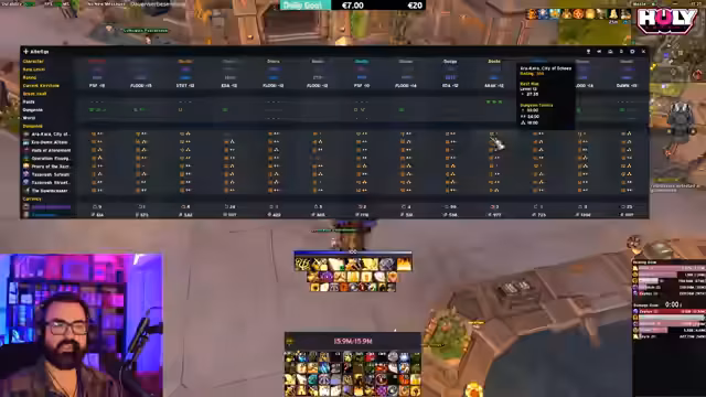 03:12:59Die Aktivitäten konzentrieren sich darauf, Schlüsselsteine für Dungeons wie Streets und Arakara zu meistern und die Stufen zu optimieren. Der Streamer beabsichtigt, Streets auf Stufe 13 oder 14 zu heilen und sucht aktiv nach einer Gruppe. Es wird diskutiert, wie viele Punkte man für bestimmte Schlüsselstufen erhält, und es werden Pläne für einen 'Doppel-Dorn-Thread' gemacht. Der Fokus liegt darauf, die Gruppenzusammenstellung zu optimieren und die Performance zu maximieren, um die wöchentlichen Ziele zu erreichen.