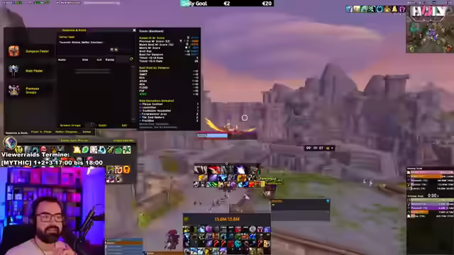 05:34:02Es wird die Vorfreude auf einen bevorstehenden Schlüsselstein-Dungeon geäußert, wobei der Streamer seine Motivation und den Spaß am Spiel betont. Die Planung für einen Mythic-Raid wird aufgrund von Verzögerungen verschoben. Es wird nach Mitspielern gesucht, wobei ein DDR-Tank und ein Windwalker-Mönch erwähnt werden. Das Ziel ist es, den aktuellen Best Try im Raid zu erreichen oder zu übertreffen, wobei die Schwierigkeit des Raids und die Bedeutung von Gearscore relativiert werden. Es folgt eine Diskussion über Interface-Anpassungen, insbesondere die Reduzierung von Items im Inventar und die Vereinfachung der Key-Auswahl. Ein Zuschauerhinweis bezüglich Debuff-Filtern im Target-Frame führt zu Verwirrung und dem Versprechen, dies später zu überprüfen und gegebenenfalls ein Update zu pushen. Abschließend wird die Routenwahl eines anderen Spielers kommentiert und eine Anekdote über einen Classic-Vorfall erzählt.