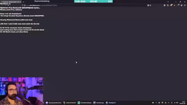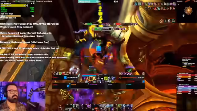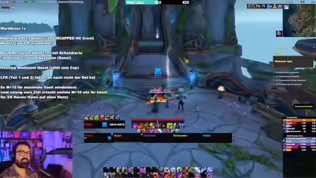 01:36:15Der Streamer informiert über den Ort der Heldmarken ab Stufe 7, die auf der Homepage unter Gear & Upgrades für Mythic Dungeons aufgelistet sind. Er erwähnt, dass man wöchentlich eine Aufladung durch ein Achievement oder 2000 Rio-Score erhalten kann und lobt Rabbit für die Neugestaltung des alten Workshops. Es werden Fix-Infos und akute Ankündigungen direkt im Stream vorgestellt, wobei 2K-Scores nur aus 6er oder 7er Keys stammen.