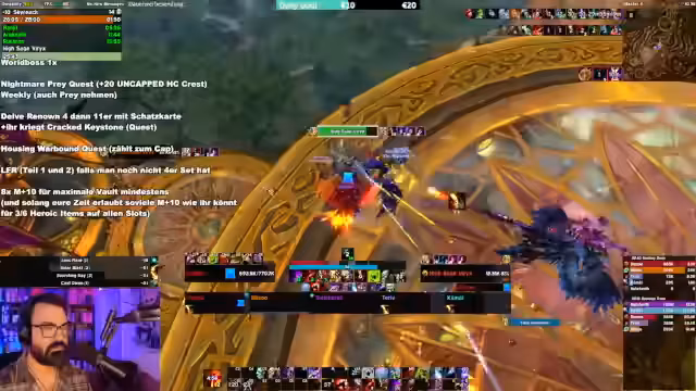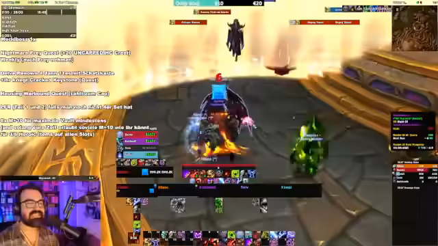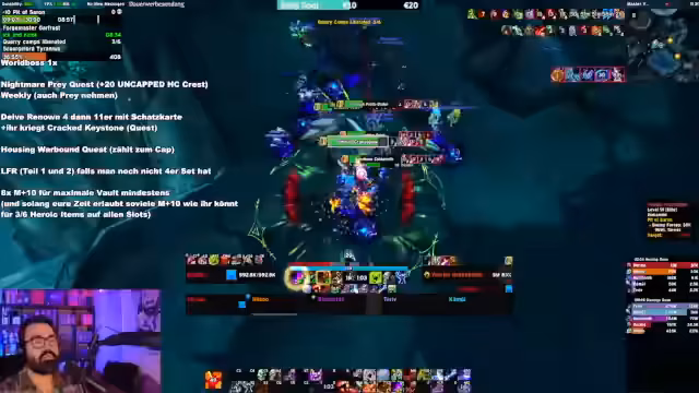 00:58:01Der Streamer startet einen M+ Dungeon mit einem Twink, um Ruhm zu farmen und bis zum Rang 4 vorzustoßen. Er erklärt die Mechanik von 'Bountiful Keys', die trotz der Benutzung keine zusätzliche XP bringen, während 'Bountiful Dungeons' selbst ein sehr effizientes Ruf-Farming sind. Während des Laufs beantwortet er Chat-Fragen zu Add-ons wie DBM und Wipe Tools und nutzt das von Blizzard offiziell empfohlene 'M++ Timer' Add-on für die Anzeige der Timer.
