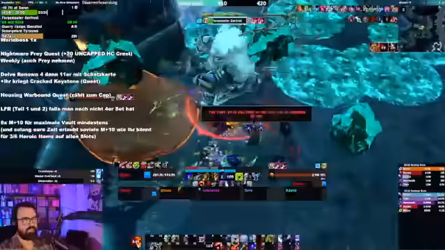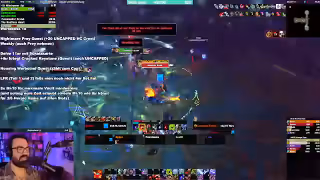 10:14:23Der Streamer analysiert seine M+-Dungeon-Erfahrungen und betont, dass 10er-Schlüssel die effizienteste Methode zum Farmen von Crests sind. Ein höheres Scaling sei aufgrund des Crest-Caps und des erhöhten Aufwands nicht sinnvoller. Er stellt jedoch fest, dass die aktuelle Performance einiger Spieler, insbesondere Tanks, auf niedrigen Stufen bereits kritisch ist. Probleme wie das Kiten von Mobs statt richtiges Tanken und mangelhafte Aggro führen zu langen und frustrierenden Dungeons.