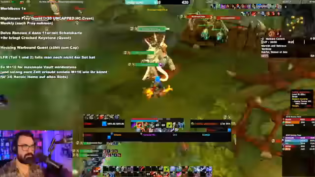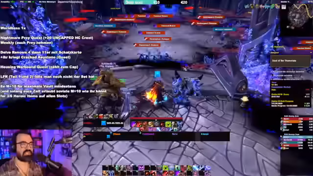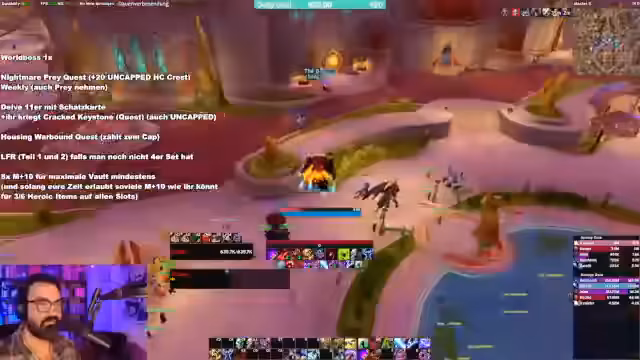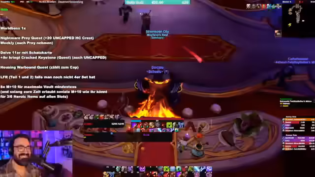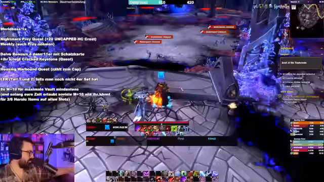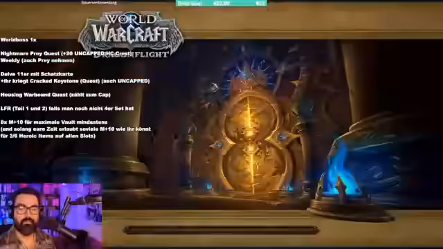 00:49:20Der Streamer stellt eine klare To-Do-Liste für die erste Woche der Season zusammen. Er rät dringend, die wöchentlichen Quests, den Weltboss, die Vault und die Daily-Quests zu erledigen. Als Priorität gelten mehrere M+10 Runs, um die notwendige Ausrüstung zu erhalten und einen soliden Start zu haben. Er warnt davor, durch falsches Craften oder falsche Vault-Auswahl den Charakter zu schädigen und motiviert die Zuschauer, den Midnight Pre-Season-Tips Guide zu studieren.