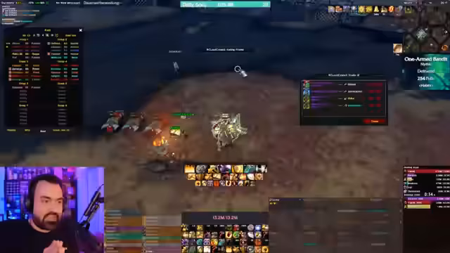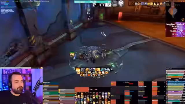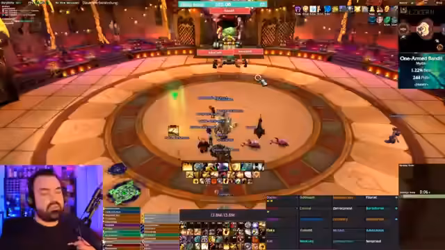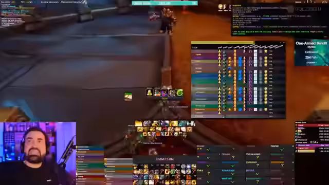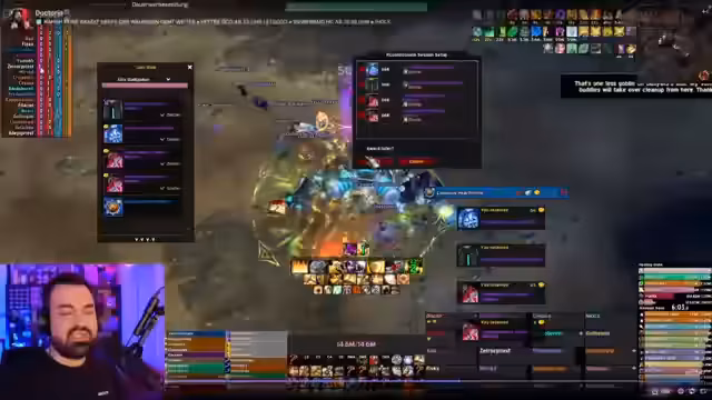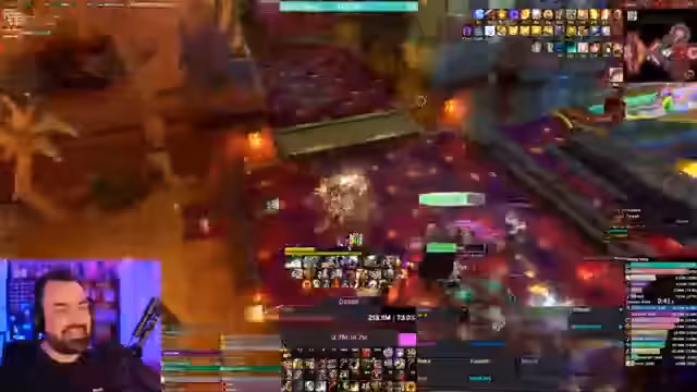 05:07:32Es gibt eine humorvolle Auseinandersetzung über eine Transmog-Rüstung, die wie ein Helm aussieht. Streamer doctorio berichtet von positiven Rückmeldungen während eines Gilden-Office-Gesprächs und lobt speziell Zerok für dessen gute Performance, der in der Vergangenheit kritisiert wurde. Die Gruppe spricht über die Kill-Order der Adds und den Fokus auf Single-Target-Damage. Eine kurze technische Unterbrechung wegen eines Mikrofonproblems wird erwähnt, ist jedoch für das Gameplay irrelevant.