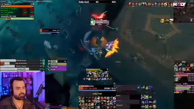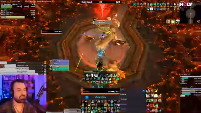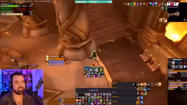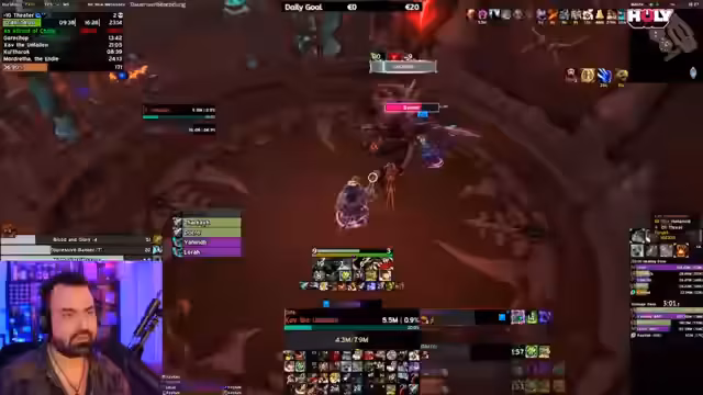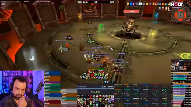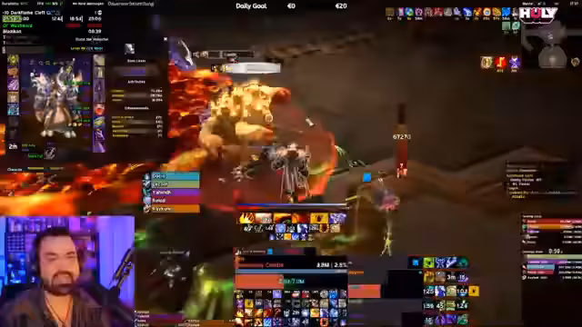 06:24:13Während des Kampfes wird deutlich mehr Damage von der Gruppe eingefordert, da der current Pace für den HC Modus zu langsam ist. Der Streamer ruft aktiv Anweisungen, wie z.B. 'Bossverbot' für alle außer den Tanks, ein. Es werden Mechaniken wie das Sammeln von Coins und das Verteilen von Buffs (AP, MDB, Stamina, Skyfury) besprochen. Der Kampf erfordert präzise Bewegungen, um bestimmten Fähigkeiten auszuweichen und sich nach Anweisungen neu zu positionieren, wie z.B. 'in die Pillers rein' oder 'rüber zur anderen Seite'.