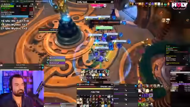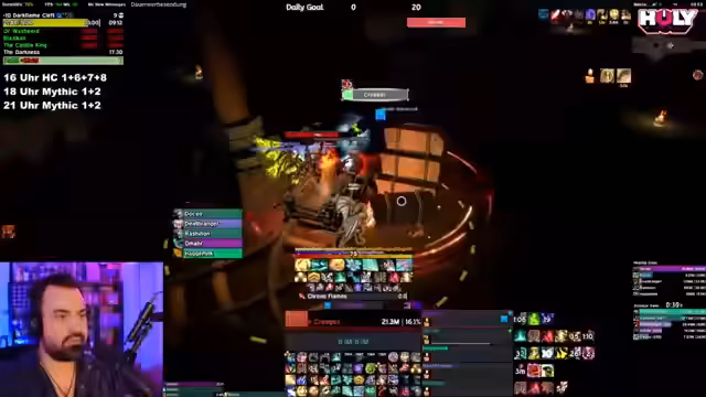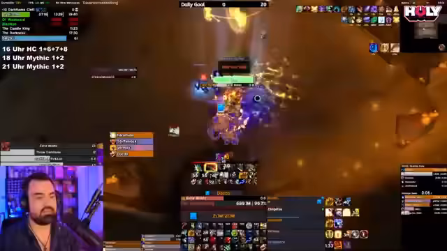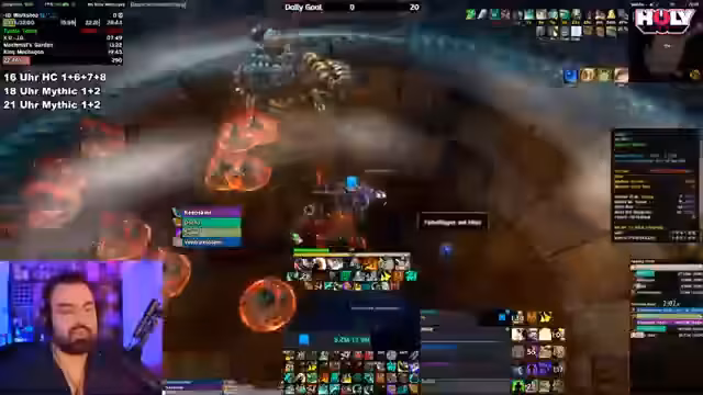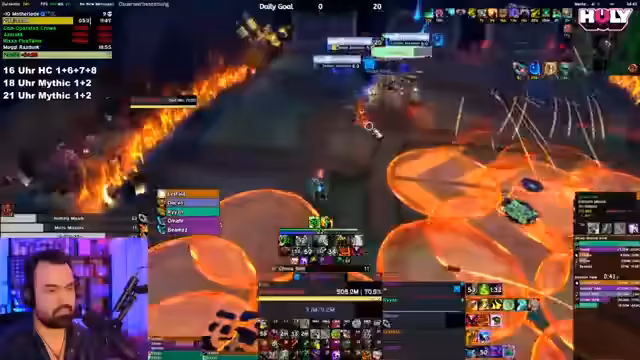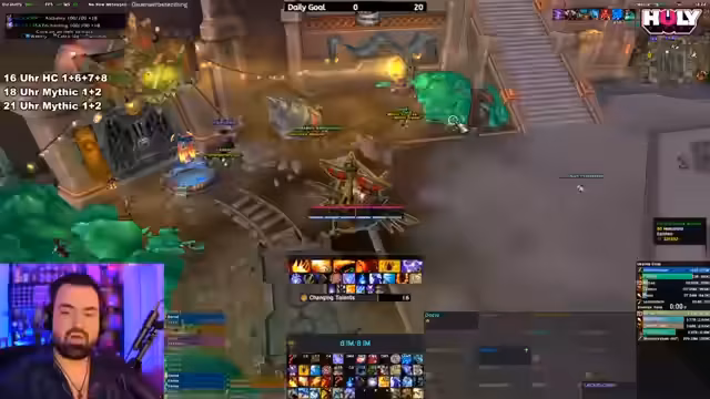 07:20:45Nach den bisherigen Aktivitäten wechselt der Streamer das Thema zu M+ (Mythic Plus Dungeons). Er bittet das Publikum um Vorschläge, welche Rolle er spielen soll, und gibt an, dass er während des Spiels die Entscheidungsbegründung erklären möchte, um vor allem neuen Spielern das Tanken näherzubringen. Der Streamer äußert den Bedarf an mehr ausgebildeten Tanks in der Community. Er initiiert den Aufbau einer M+-Gruppe für einen 13er-Schlüssel, gibt Empfehlungen für passende Schlüssel und Dungeons, und warnt davor, dass ein 13er-Niveau mehr Aufmerksamkeit und Koordination erfordert als niedrigere Schwierigkeitsgrade.