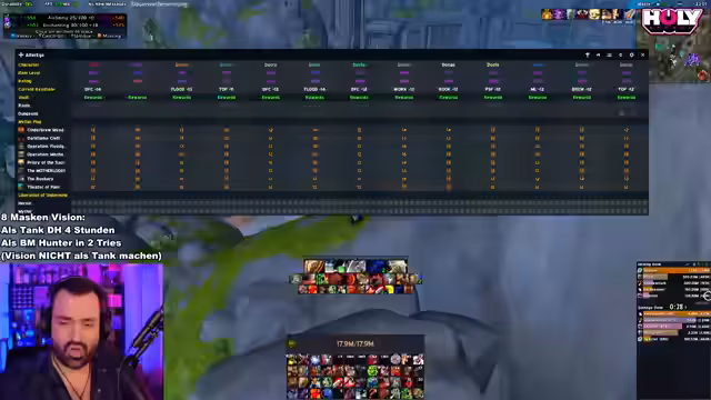 00:00:05Zu Beginn des Streams analysiert der Streamer seine aktuelle Situation mit der Gammon-Maske, die ihm Sanity zurückgibt, was sehr vorteilhaft ist. Er experimentiert mit der Anzahl aktiver Masken und kommt auf vier. Im Vergleich zu Visionen aus BFA bewertet er die aktuellen Orgrimmar-Visionen als deutlich einfacher. Er identifiziert die Masken-Farben mit ihren Effekten: Blau ist Breath of Fire, Lila ist Poison. Die Mobility und der Self-Sustain der Klasse sind entscheidend für einen erfolgreichen Lauf. Als besonders effektiv für 8 Masken nennt er den BM Hunter und den Fire Mage, wenn dieser gut mit Schimmer, Ignite-Spreading und Scorch umgehen kann.