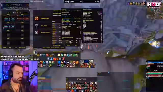 03:19:14Es wird das Setup für den Raid 'Bandit' diskutiert. Der Streamer benötigt spezifische Klassen und Rollen, um den Erfolg des Raids sicherzustellen. Er sucht insbesondere nach Heiler und Tanks und prüft die Qualifikationen der potenziellen Teilnehmer, wie beispielsweise die Anzahl der geschlagenen Mythic-Bosse.