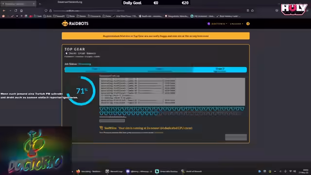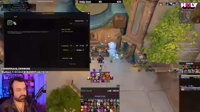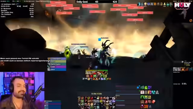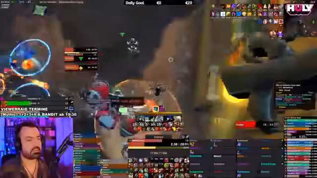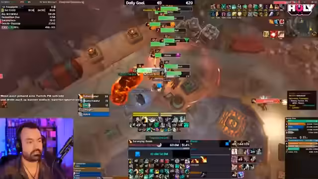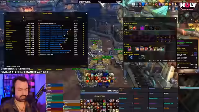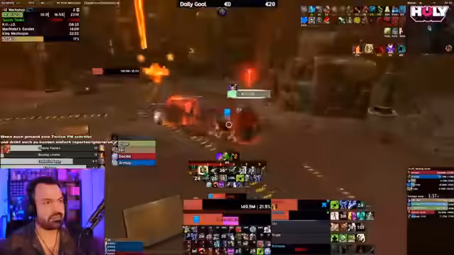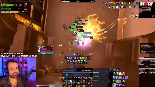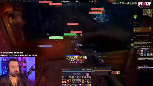 05:18:42Der Stream startet mit einem Versuch, den Bandit Mythic im Viewer Raid zu meistern. Der Streamer diskutiert über die Mechaniken, speziell über das Ausbringen von Flammen und das Platzieren von Coins. Es kommt zu technischen Problemen und einem unerwarteten Austritt eines Teammitglieds, was zu einer Unterbrechung des Streams führt. Der Streamer sucht nach Ersatz und plant einen Neustart des Versuchs.