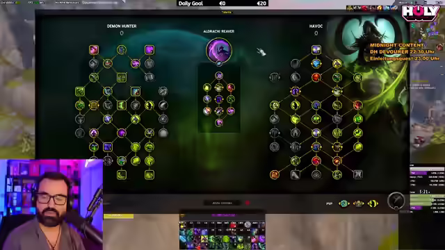 05:24:58Es wird der Havoc-Spec (Verwüstung) betrachtet, um die Unterschiede zum Vengeance-Spec zu untersuchen. Es wird bereits vermutet, dass sich auch hier kaum etwas verändert hat. 'Demonic' ist jetzt nur noch für Havoc verfügbar. 'The Hunt' ist ebenfalls nur noch für Havoc verfügbar. 'Fel Barrage', 'Fel Eruption' und 'Sigil of Spite' sind verschwunden. 'Netherwalk' und 'Left Dance' sind passiv. Es wird ein Build verglichen und festgestellt, dass 'Fel Eruption', 'Fel Barrage', 'Netherwalk' und weitere Fähigkeiten entfernt wurden. Ein Cooldown-Manager wird aktiviert, um die empfohlene Rotation anzuzeigen. Es wird festgestellt, dass der empfohlene Build noch fehlerhaft ist und Glävenwurf empfiehlt, obwohl dieser nicht optimal ist. Es wird spekuliert, dass die Zukunft von WoW darin bestehen könnte, sich auf den Charakter einzuloggen, die Fähigkeiten in die Leiste zu ziehen und dann dem Cooldown-Manager zu folgen. Der Cooldown-Manager wird als eine vereinfachte Version von WeakAuras beschrieben.