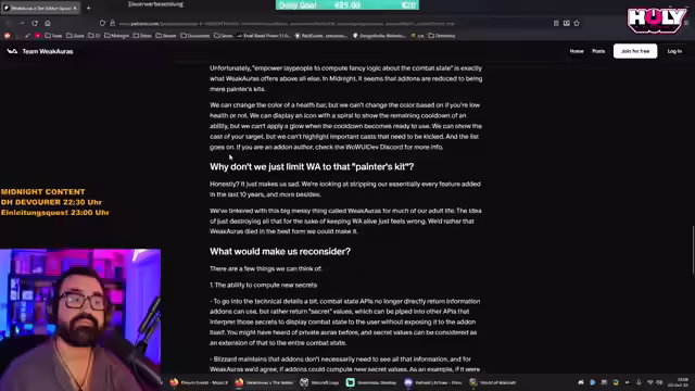 00:29:46Es gibt viele Neuigkeiten, darunter ein kurzer Blick auf die Midnight Alpha, wo Devora erstellt, aber nicht gespielt wurde. Der Streamer betont, dass Midnight als die fünfte Ära von WoW betrachtet wird, beginnend mit WoW Classic und Burning Crusade, die erste Ära, gefolgt von Kataklysm bis Warlords of Draenor als zweite Ära. Legion markierte die dritte Ära mit dem Aufkommen von M+. Dragonflight wurde offiziell von Blizzard als vierte Ära bezeichnet, mit Fokus auf Open-World-Solo-Content. Nun steht mit Midnight die fünfte Ära bevor, die vor allem durch die Abschaffung der meisten Kampf-Addons gekennzeichnet sein wird. Viele Addon-Entwickler ziehen sich bereits zurück. Betroffen sind alle Addons, die auf Combat-Events zugreifen, was Buff- und Debuff-Tracking unmöglich macht. Klassen-WeakAuren werden ebenfalls nicht mehr funktionieren. Dies ist eine bewusste Entscheidung von Blizzard, um das Spiel zugänglicher zu machen und die Komplexität zu reduzieren. Es wird jedoch Ersatz-Addons von Blizzard geben, wie Nameplates und Damage Meter, die serverseitig berechnet werden. Ein Patchnote mit den Änderungen ist in der Kanalbeschreibung verlinkt, der eine farblich formatierte Version der Informationen bietet.