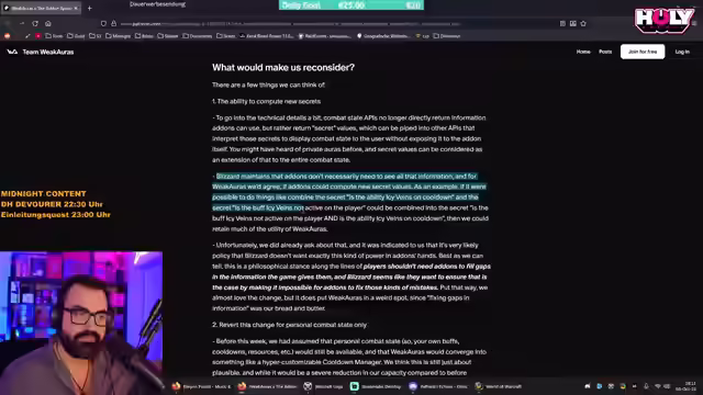 04:57:08Die WeakAuras-Entwickler äußern sich dazu, was Blizzard tun müsste, damit sie ihre Entscheidung überdenken. Sie fordern die Möglichkeit, neue Geheimniswerte zu berechnen. Blizzard argumentiert, dass Addons nicht unbedingt alle Informationen sehen müssen, was die WeakAuras-Entwickler grundsätzlich verstehen. Sie schlagen vor, dass Addons in der Lage sein sollten, neue Geheimniswerte zu berechnen, indem sie beispielsweise den Cooldown von 'Icy Veins' mit dem Status 'Icy Veins nicht aktiv' kombinieren. Dies würde es ermöglichen, einen Großteil der Funktionalität von WeakAuras zu erhalten. Aktuell ist es jedoch nicht möglich, Geheimnisse zu berechnen. Die Entwickler fragen nicht nach dem vollständigen Zugriff auf Geheimnisse, sondern lediglich nach der Möglichkeit, zwei Geheimnisse zu kombinieren. Diese minimale Anfrage wird von Blizzard abgelehnt, was die Hoffnung auf zukünftige Zugeständnisse stark reduziert. Es wird befürchtet, dass Blizzard in Zukunft keinerlei Zugeständnisse machen wird, selbst bei kleinen Anfragen.