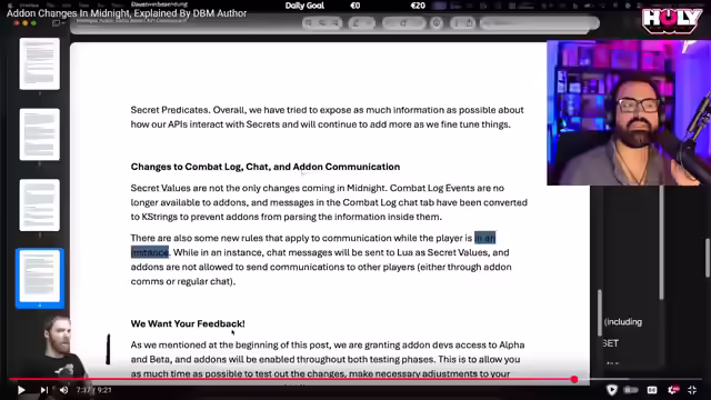 05:02:05Es wird festgestellt, dass eines der größten Features von Midnight nicht nur Housing sein wird, sondern auch der Zeitpunkt, an dem Addons sterben. Ein Video zu diesem Thema wurde bereits hochgeladen und soll von Zuschauern angesehen werden, um die aktuelle Situation zu verstehen. Es wird erwartet, dass Spieler ihre Rotationen neu erlernen müssen, da sie nicht mehr auf Addons wie Hekili zurückgreifen können. Es wird klargestellt, dass Combat-Addons, die in instanzierten Bereichen oder im Kampf stattfinden, nicht mehr funktionieren werden. Addons, die außerhalb von Kämpfen oder in Städten verwendet werden, wie MDT zum Planen von Routen oder SIMC zum Simulieren von Charakteren, bleiben jedoch funktionsfähig. Es wird vermutet, dass Blizzard die populärsten Addons übernommen hat und die restlichen Addons zerstört. Es wird empfohlen, das Video anzusehen, um die Tragweite der bevorstehenden Veränderungen zu begreifen.