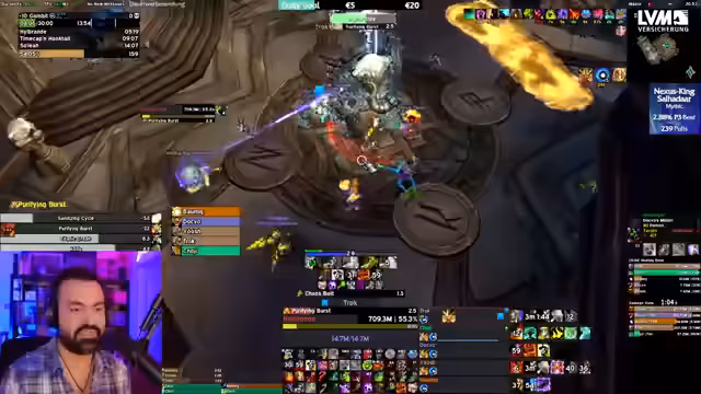 09:08:39Es wird über die Raid-Tage und mögliche Setup-Anpassungen diskutiert. Es wird entschieden, dass am Dienstag Lurks durch Mage-Auxillian ersetzt wird und in der darauffolgenden Woche am Mittwoch Storm für eine Stunde ausfällt. Der Streamer äußert den Wunsch, in den mythischen Modus zu wechseln, sobald der 3%-Buff aktiv ist, und fragt, ob die Spieler bereit sind, sich außerhalb der Raid-Zeiten in heroischen Dungeons vorzubereiten, um den 6%-Buff zu erhalten. Es wird über die Anzahl der benötigten Pulls für den Boss diskutiert und ob es realistisch ist, ihn innerhalb von sieben Raid-Nächten zu besiegen. Die Bedeutung guter Vorbereitung auf Phase 1 und Analyse von Phase 2 wird hervorgehoben, um am Wochenende Fortschritte zu erzielen. Es wird angekündigt, dass Lurks am Dienstag ersetzt wird und Alex als Krips einspringen kann. Es wird überlegt, ob Selein verfügbar ist, um den Demon Hunter zu spielen. Der Streamer kündigt an, dass er den Mausefeilen-Raid nächste Woche absagen muss und stattdessen am Montag einen Ersatztermin anbietet. Es wird die Möglichkeit von Backups bei bestimmten Mechaniken diskutiert, solange dies rechtzeitig kommuniziert wird.