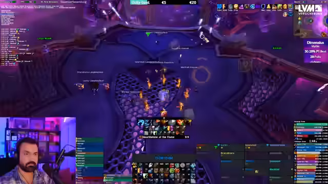 Die Session behandelt Quest-Design-Probleme in WoW, die Entdeckung eines Bugs im Echo-Dome, und eine kritische Auseinandersetzung mit der WoW-Philosophie. Es geht um Gilden-Progress bei Nexus King, Demon Hunter Fun-Runs, Heilen der Sühne, PI-Mechaniken, Stressbewältigung, Sparverhalten, Serverrelevanz, Psychologie im Spiel, Arbeitsumfeld, Klassenempfehlungen, FPS-Probleme, Gildenvorbereitung, Schamanen-Strategien, Mythic Plus Dungeons, Raid-Planung, Knockback-Mechaniken und Opener-Strategien.